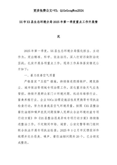【七哥公文】2025年:XX市XX县生态环境分局2025年第一季度重点工作开展情况+更多免费公文+VX:QiGeGongWen2024+更多免费公文+VX:QiGeGongWen2024