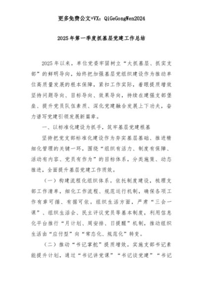 【七哥公文】2025年:2025年第一季度抓基层党建工作总结+更多免费公文+VX:QiGeGongWen2024+更多免费公文+VX:QiGeGongWen2024