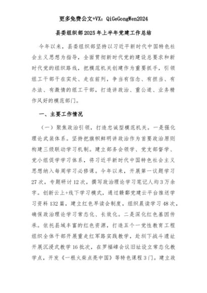 【七哥公文】2025年:县委组织部2025年上半年党建工作总结+更多免费公文+VX:QiGeGongWen2024+更多免费公文+VX:QiGeGongWen2024