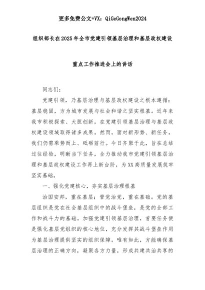 【七哥公文】2025年:组织部长在2025年全市党建引领基层治理和基层政权建设重点工作推进会上的讲话+更多免费公文+VX:QiGeGongWen2024+更多免费公文+VX:QiGeGongWen2024