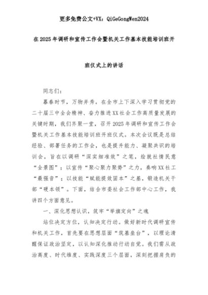 【七哥公文】2025年:在2025年调研和宣传工作会暨机关工作基本技能培训班开班仪式上的讲话+更多免费公文+VX:QiGeGongWen2024+更多免费公文+VX:QiGeGongWen2024