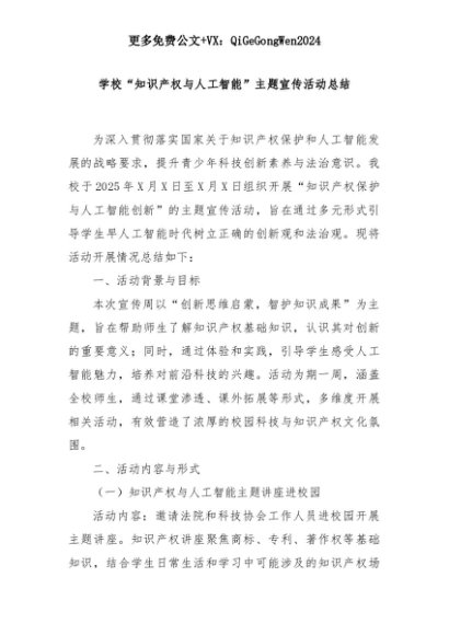 【七哥公文】2025年:学校“知识产权与人工智能”主题宣传活动总结+更多免费公文+VX:QiGeGongWen2024+更多免费公文+VX:QiGeGongWen2024