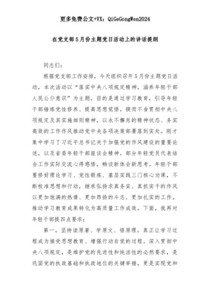 【七哥公文】2025年:在党支部5月份主题党日活动上的讲话提纲+更多免费公文+VX:QiGeGongWen2024+更多免费公文+VX:QiGeGongWen2024