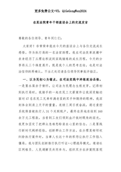 【七哥公文】2025年:在某法院青年干部座谈会上的交流发言+更多免费公文+VX:QiGeGongWen2024+更多免费公文+VX:QiGeGongWen2024
