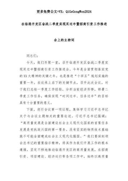 【七哥公文】2025年:在临港开发区奋战二季度实现双过半暨招商引资工作推进会上的主持词+更多免费公文+VX:QiGeGongWen2024+更多免费公文+VX:QiGeGongWen2024