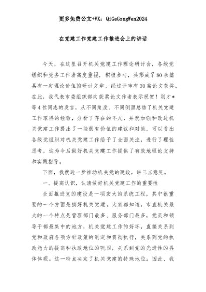 【七哥公文】2025年:在党建工作党建工作推进会上的讲话+更多免费公文+VX:QiGeGongWen2024+更多免费公文+VX:QiGeGongWen2024