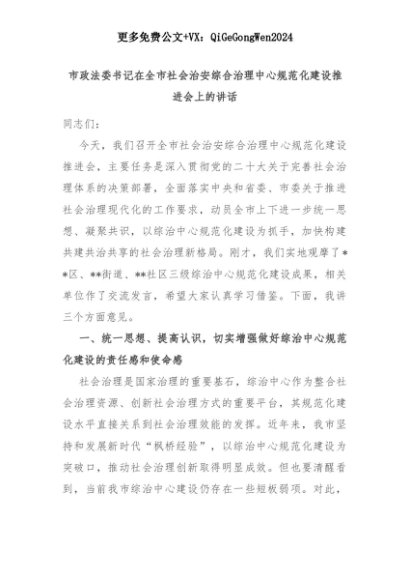 【七哥公文】2025年:市政法委书记在全市社会治安综合治理中心规范化建设推进会上的讲话+更多免费公文+VX:QiGeGongWen2024+更多免费公文+VX:QiGeGongWen2024