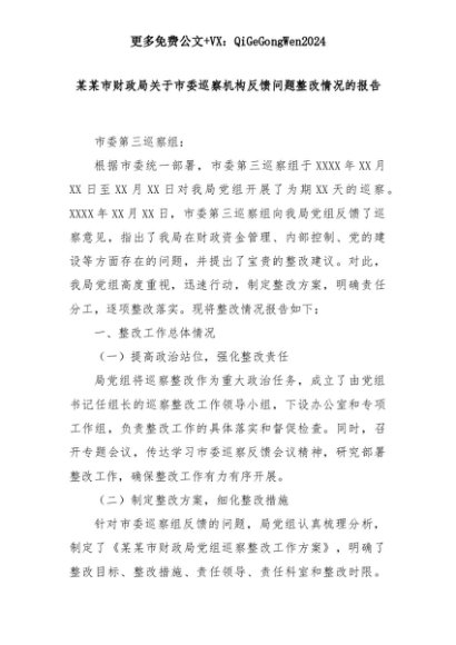 【七哥公文】2025年:某某市财政局关于市委巡察机构反馈问题整改情况的报告+更多免费公文+VX:QiGeGongWen2024+更多免费公文+VX:QiGeGongWen2024