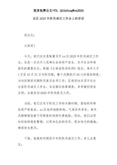 【七哥公文】2025年:在区2025年防汛减灾工作会上的讲话+更多免费公文+VX:QiGeGongWen2024+更多免费公文+VX:QiGeGongWen2024