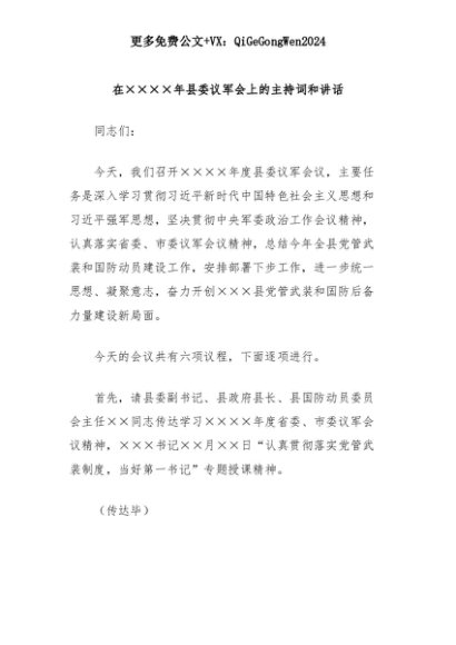 【七哥公文】2025年:在××××年县委议军会上的主持词和讲话+更多免费公文+VX:QiGeGongWen2024+更多免费公文+VX:QiGeGongWen2024
