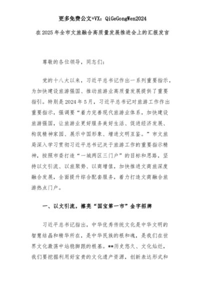 【七哥公文】2025年:在2025年全市文旅融合高质量发展推进会上的汇报发言+更多免费公文+VX:QiGeGongWen2024+更多免费公文+VX:QiGeGongWen2024