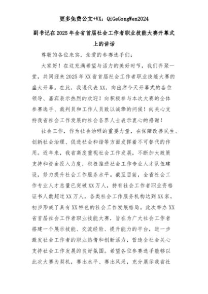 【七哥公文】2025年:副书记在2025年全省首届社会工作者职业技能大赛开幕式上的讲话+更多免费公文+VX:QiGeGongWen2024+更多免费公文+VX:QiGeGongWen2024