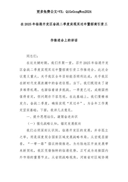【七哥公文】2025年:在2025年临港开发区奋战二季度实现双过半暨招商引资工作推进会上的讲话+更多免费公文+VX:QiGeGongWen2024+更多免费公文+VX:QiGeGongWen2024