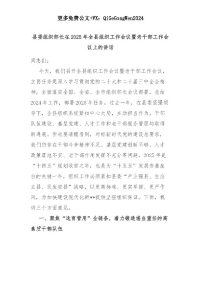 【七哥公文】2025年:县委组织部长在2025年全县组织工作会议暨老干部工作会议上的讲话+更多免费公文+VX:QiGeGongWen2024+更多免费公文+VX:QiGeGongWen2024