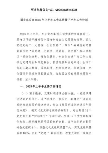【七哥公文】2025年:国企办公室2025年上半年工作总结暨下半年工作计划+更多免费公文+VX:QiGeGongWen2024+更多免费公文+VX:QiGeGongWen2024