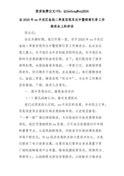 【七哥公文】2025年:在2025年xx开发区奋战二季度实现双过半暨招商引资工作推进会上的讲话+更多免费公文+VX:QiGeGongWen2024+更多免费公文+VX:QiGeGongWen2024