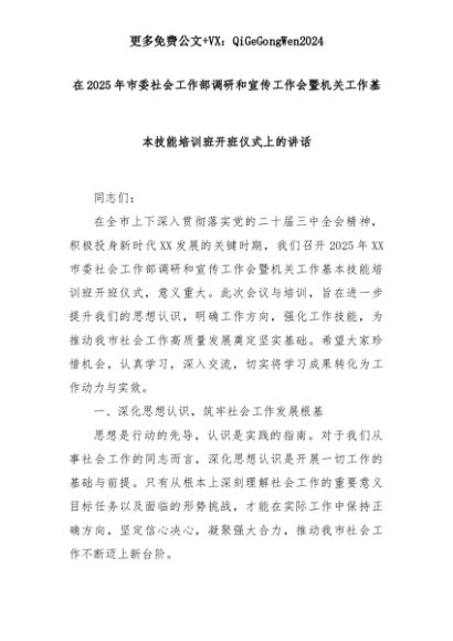 【七哥公文】2025年:在2025年市委社会工作部调研和宣传工作会暨机关工作基本技能培训班开班仪式上的讲话+更多免费公文+VX:QiGeGongWen2024+更多免费公文+VX:QiGeGongWen2024
