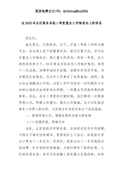 【七哥公文】2025年:在2025年全区商务系统二季度重点工作推进会上的讲话+更多免费公文+VX:QiGeGongWen2024+更多免费公文+VX:QiGeGongWen2024