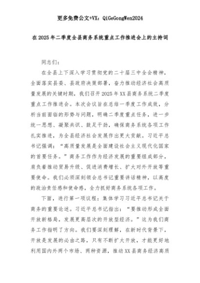 【七哥公文】2025年:在2025年二季度全县商务系统重点工作推进会上的主持词+更多免费公文+VX:QiGeGongWen2024+更多免费公文+VX:QiGeGongWen2024