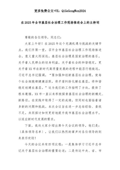 【七哥公文】2025年:在2025年全市基层社会治理工作现场推进会上的主持词+更多免费公文+VX:QiGeGongWen2024+更多免费公文+VX:QiGeGongWen2024