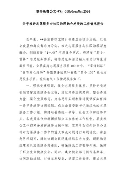 【七哥公文】2025年:关于推进志愿服务与社区治理融合发展的工作情况报告+更多免费公文+VX:QiGeGongWen2024+更多免费公文+VX:QiGeGongWen2024