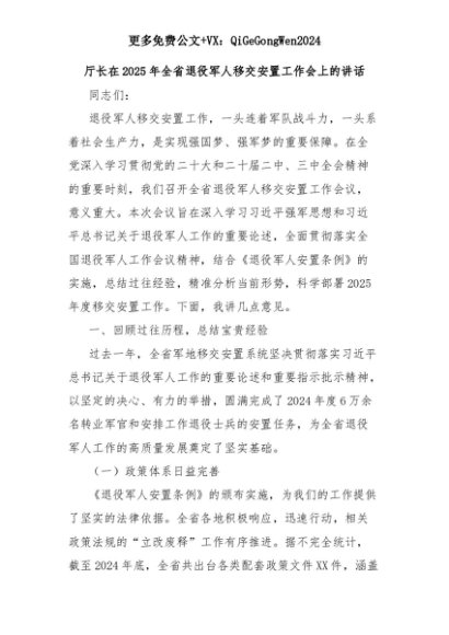 【七哥公文】2025年:厅长在2025年全省退役军人移交安置工作会上的讲话+更多免费公文+VX:QiGeGongWen2024+更多免费公文+VX:QiGeGongWen2024
