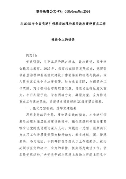 【七哥公文】2025年:在2025年全省党建引领基层治理和基层政权建设重点工作推进会上的讲话+更多免费公文+VX:QiGeGongWen2024+更多免费公文+VX:QiGeGongWen2024
