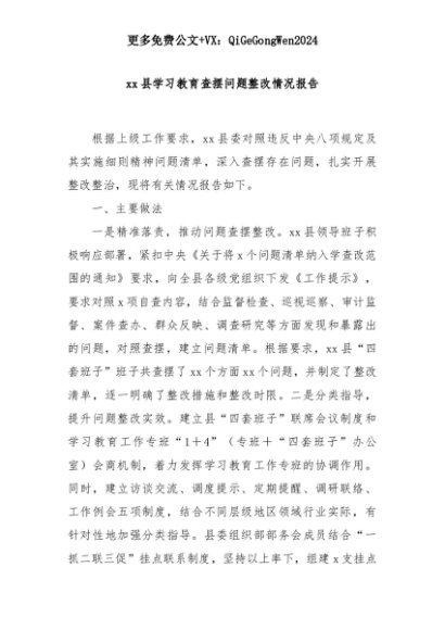 【七哥公文】2025年:xx县学习教育查摆问题整改情况报告+更多免费公文+VX:QiGeGongWen2024+更多免费公文+VX:QiGeGongWen2024