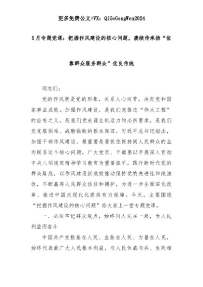 【七哥公文】2025年:5月专题党课:把握作风建设的核心问题,赓续传承扬“依靠群众服务群众”优良传统+更多免费公文+VX:QiGeGongWen2024+更多免费公文+VX:QiGeGongWen2024