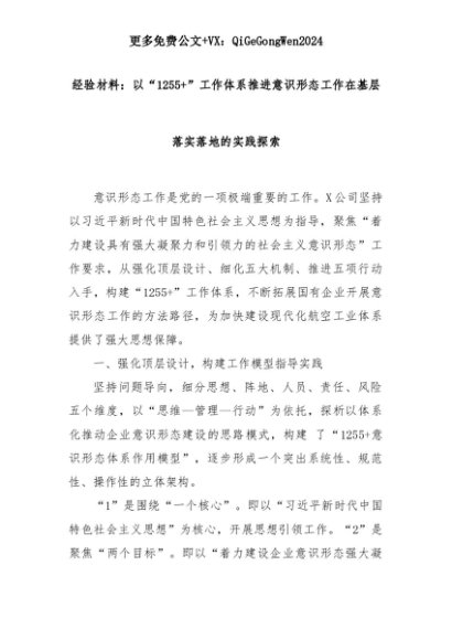 【七哥公文】2025年:经验材料:以“1255+”工作体系推进意识形态工作在基层落实落地的实践探索+更多免费公文+VX:QiGeGongWen2024+更多免费公文+VX:QiGeGongWen2024
