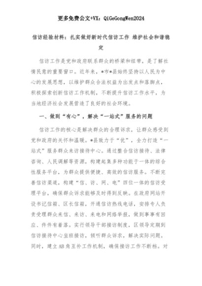 【七哥公文】2025年:信访经验材料:扎实做好新时代信访工作 维护社会和谐稳定+更多免费公文+VX:QiGeGongWen2024+更多免费公文+VX:QiGeGongWen2024