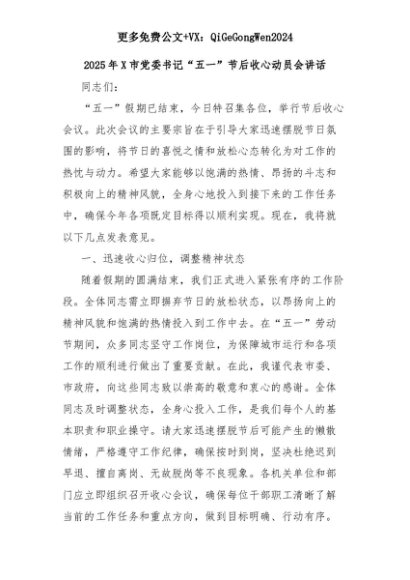 【七哥公文】2025年:2025年X市党委书记“五一”节后收心动员会讲话+更多免费公文+VX:QiGeGongWen2024+更多免费公文+VX:QiGeGongWen2024