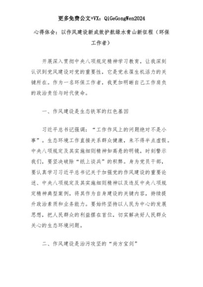 【七哥公文】2025年:心得体会:以作风建设新成效护航绿水青山新征程(环保工作者)+更多免费公文+VX:QiGeGongWen2024+更多免费公文+VX:QiGeGongWen2024