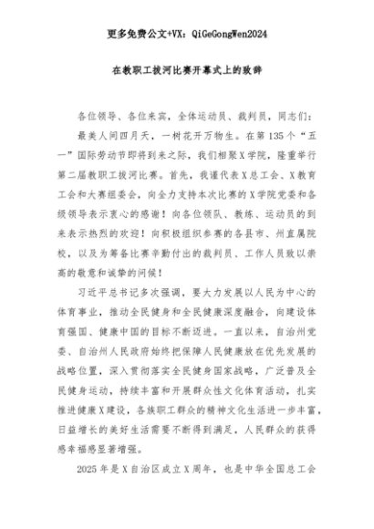 【七哥公文】2025年:在教职工拔河比赛开幕式上的致辞+更多免费公文+VX:QiGeGongWen2024+更多免费公文+VX:QiGeGongWen2024