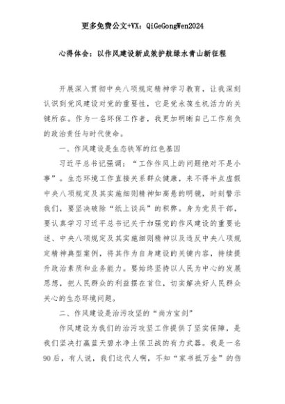 【七哥公文】2025年:心得体会:以作风建设新成效护航绿水青山新征程+更多免费公文+VX:QiGeGongWen2024+更多免费公文+VX:QiGeGongWen2024