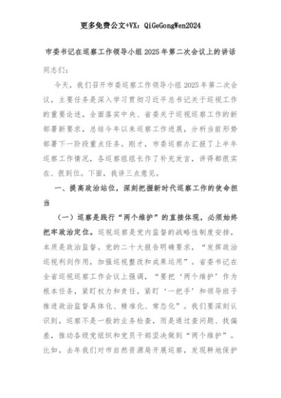 【七哥公文】2025年:市委书记在巡察工作领导小组2025年第二次会议上的讲话+更多免费公文+VX:QiGeGongWen2024+更多免费公文+VX:QiGeGongWen2024