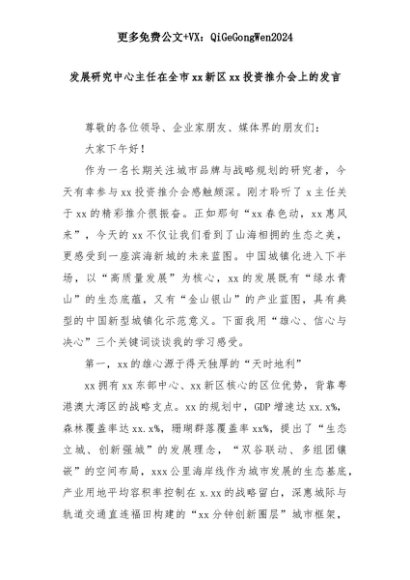 【七哥公文】2025年:发展研究中心主任在全市xx新区xx投资推介会上的发言+更多免费公文+VX:QiGeGongWen2024+更多免费公文+VX:QiGeGongWen2024