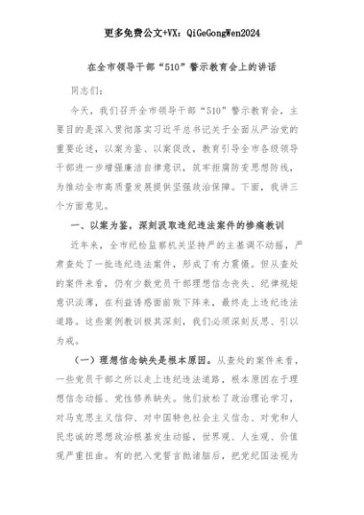 【七哥公文】2025年:在全市领导干部“510”警示教育会上的讲话+更多免费公文+VX:QiGeGongWen2024+更多免费公文+VX:QiGeGongWen2024