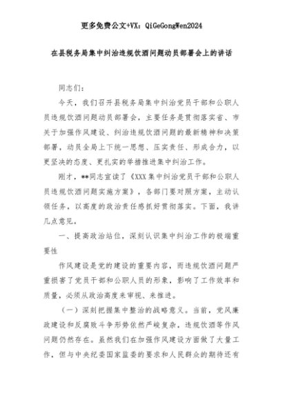 【七哥公文】2025年:在县税务局集中纠治违规饮酒问题动员部署会上的讲话+更多免费公文+VX:QiGeGongWen2024+更多免费公文+VX:QiGeGongWen2024
