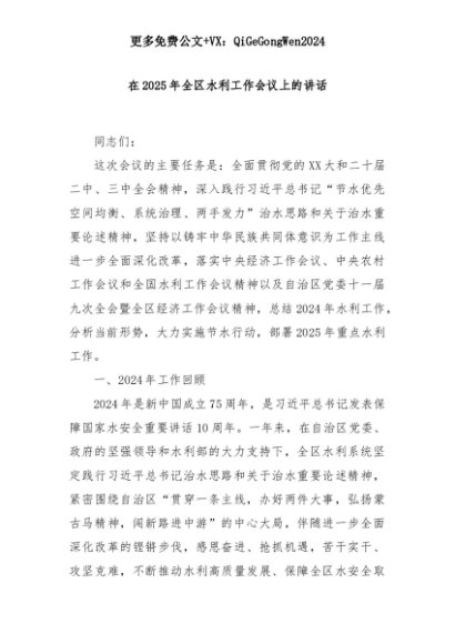 【七哥公文】2025年:在2025年全区水利工作会议上的讲话+更多免费公文+VX:QiGeGongWen2024+更多免费公文+VX:QiGeGongWen2024