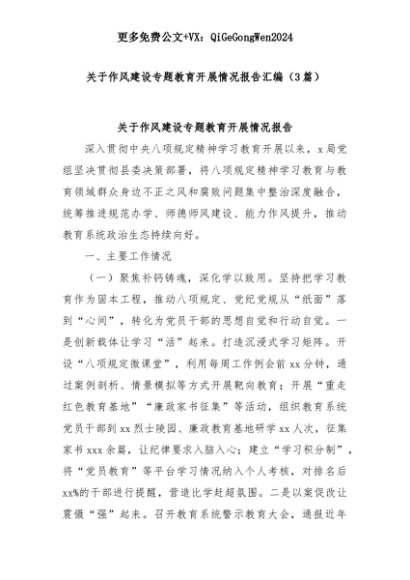 【七哥公文】2025年:(3篇)关于作风建设专题教育开展情况报告汇编+更多免费公文+VX:QiGeGongWen2024+更多免费公文+VX:QiGeGongWen2024