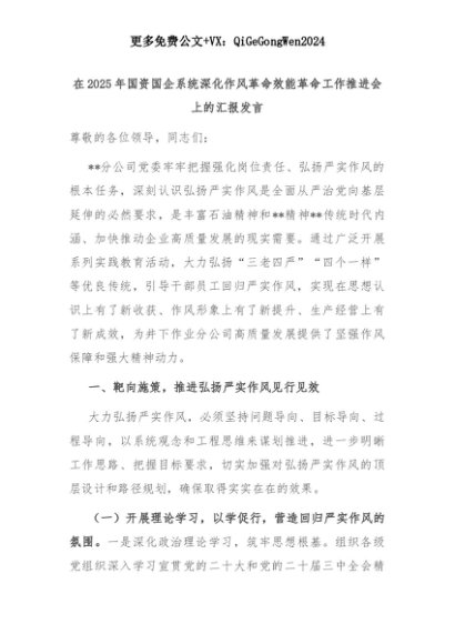 【七哥公文】2025年:在2025年国资国企系统深化作风革命效能革命工作推进会上的汇报发言+更多免费公文+VX:QiGeGongWen2024+更多免费公文+VX:QiGeGongWen2024