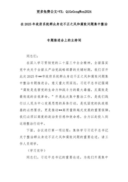 【七哥公文】2025年:在2025年政府系统群众身边不正之风和腐败问题集中整治专题推进会上的主持词+更多免费公文+VX:QiGeGongWen2024+更多免费公文+VX:QiGeGongWen2024