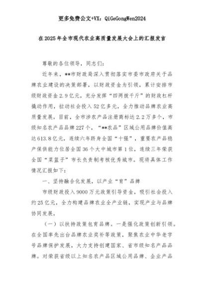 【七哥公文】2025年:在2025年全市现代农业高质量发展大会上的汇报发言+更多免费公文+VX:QiGeGongWen2024+更多免费公文+VX:QiGeGongWen2024