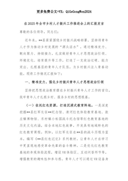 【七哥公文】2025年:在2025年全市乡村人才振兴工作推进会上的汇报发言+更多免费公文+VX:QiGeGongWen2024+更多免费公文+VX:QiGeGongWen2024