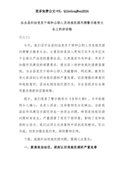 【七哥公文】2025年:在全县纠治党员干部和公职人员违规饮酒问题警示教育大会上的讲话稿+更多免费公文+VX:QiGeGongWen2024+更多免费公文+VX:QiGeGongWen2024