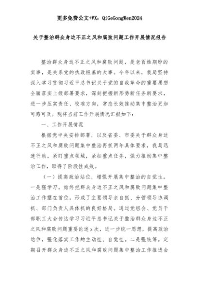 【七哥公文】2025年:关于整治群众身边不正之风和腐败问题工作开展情况报告+更多免费公文+VX:QiGeGongWen2024+更多免费公文+VX:QiGeGongWen2024