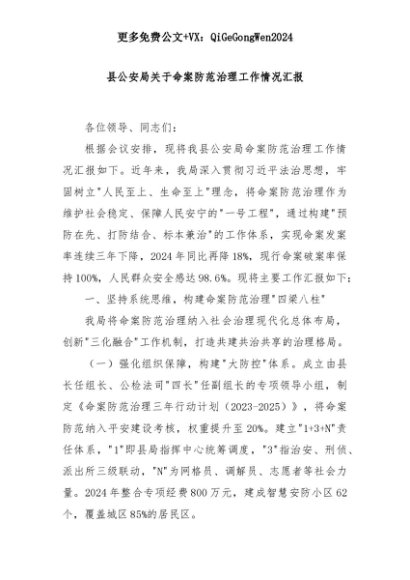 【七哥公文】2025年:县公安局关于命案防范治理工作情况汇报+更多免费公文+VX:QiGeGongWen2024+更多免费公文+VX:QiGeGongWen2024