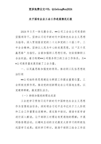 【七哥公文】2025年:关于国有企业工会工作进展情况汇报+更多免费公文+VX:QiGeGongWen2024+更多免费公文+VX:QiGeGongWen2024