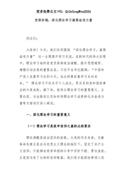 【七哥公文】2025年:党课讲稿:深化理论学习凝聚奋进力量+更多免费公文+VX:QiGeGongWen2024+更多免费公文+VX:QiGeGongWen2024